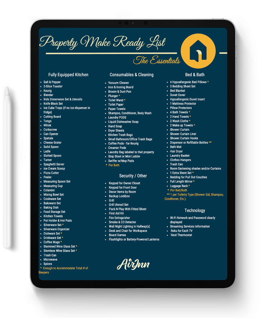 This checklist covers all the essentials (and some fun extras) you need to stock your rental.